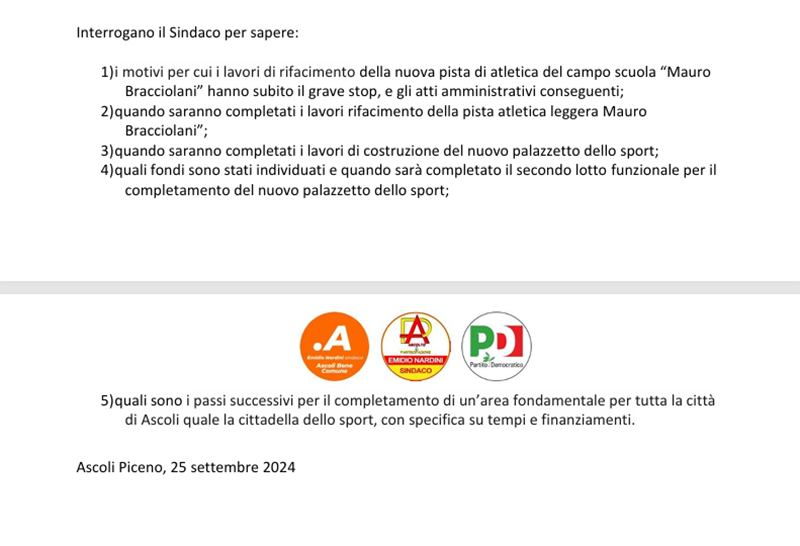 La prima cosa che viene in mente nel leggere l’interrogazione presentata da Ascolto & Partecipazione, Ascoli Bene Comune e Partito Democratico, sull’imbarazzante situazione della pista di atletica e della “cittadella dello sport”, è che i gruppi consiliari di opposizione mai come in questo caso avevano l’imbarazzo della scelta. Perché sulla situazione e sulle ataviche carenze degli impianti sportivi cittadini si potrebbe presentare quasi un’interrogazione al giorno.